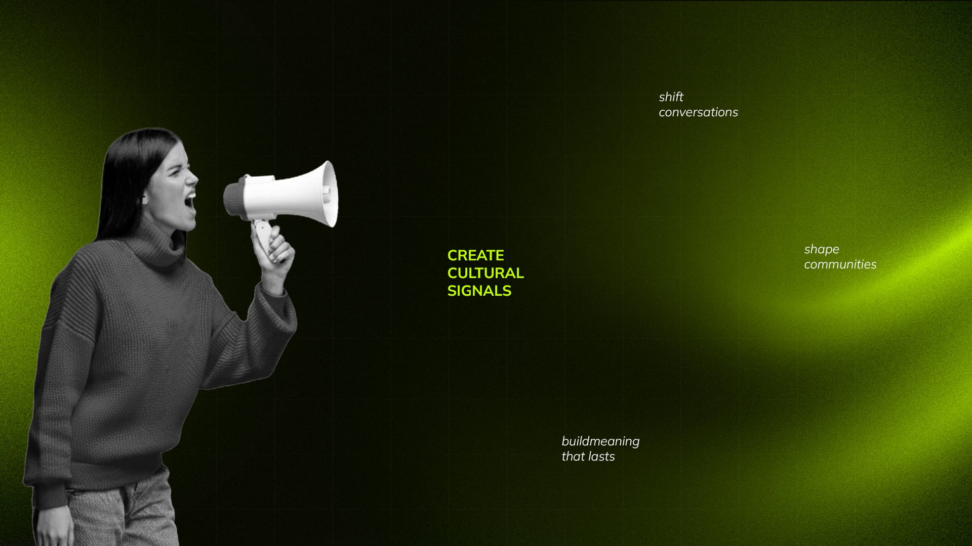 We create cultural signals that people feel — not scroll past.Our work doesn’t end with impressions; it begins with impact.We shift conversations, shape communities, and build meaning that lasts.
